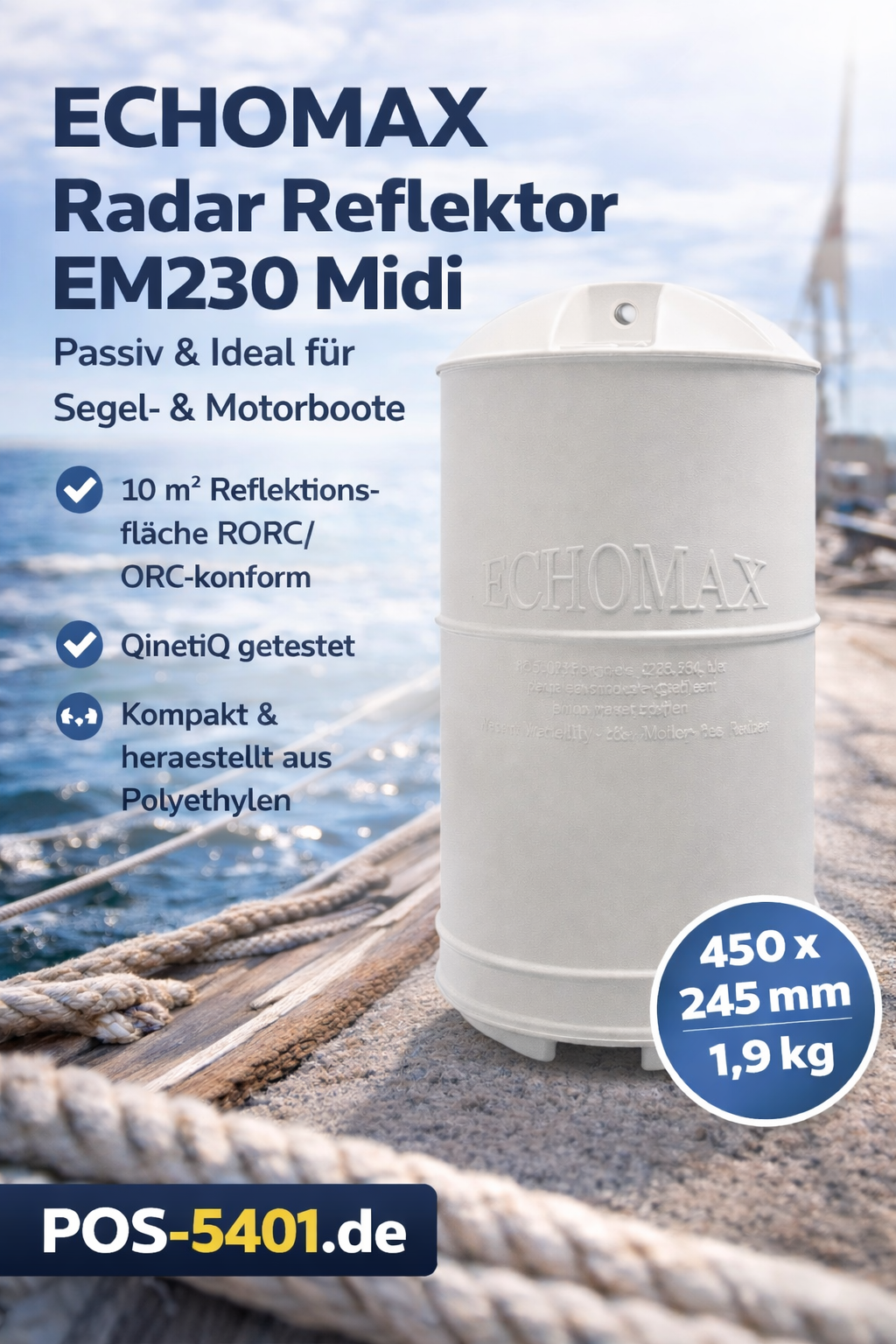 Der ECHOMAX EM230 Midi ist der kleinste Radarreflektor der bewährten 230er Serie und bietet dennoch eine außergewöhnlich hohe Radarreflexion – ideal für Segel- und Motoryachten sowie kleinere Motorboote.