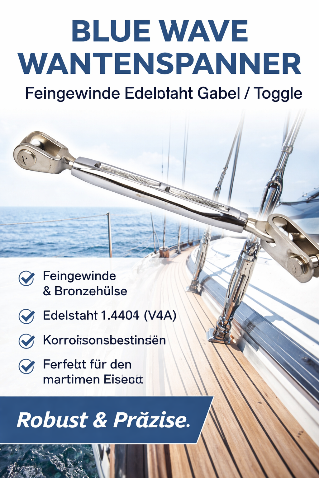 Der BLUE WAVE Wantenspanner mit Feingewinde überzeugt durch erstklassige Materialien und präzise Verarbeitung. Die offene Bronzehülse sorgt für hohe Stabilität und einfache Sichtkontrolle, während die Gabel / Toggle aus Edelstahl 1.4401 (V4A) maximale Korrosionsbeständigkeit selbst unter anspruchsvollen maritimen Bedingungen bietet.
